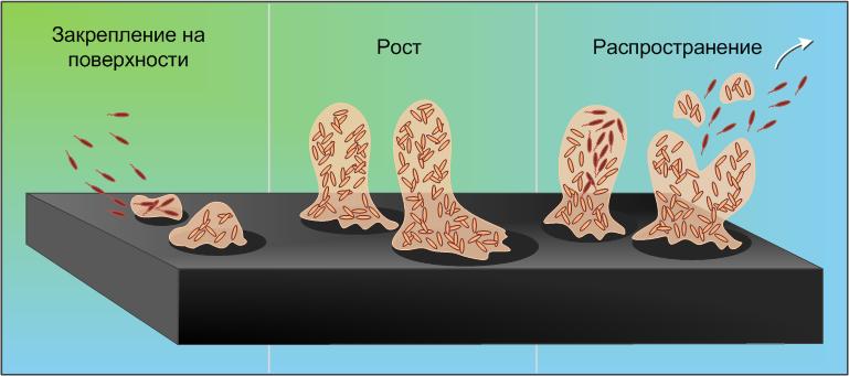 Прикрепившись к поверхности, бактерии постепенно покрываются клейким веществом, состоящим из продуктов их жизнедеятельности (молекул сахаров, белков, нуклеиновых кислот) и компонентов окружающей среды, и образуют так называемую биопленку.